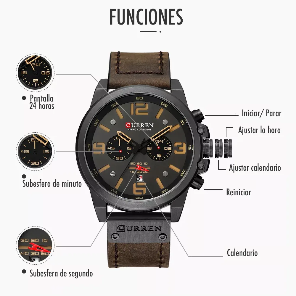 El Reloj Curren 8314 es un cronógrafo para hombre que combina diseño y funcionalidad. Caja en acero inoxidable, correa en cuero con cierre hebilla. Movimiento cuarzo, Cronógrafos funcionales, Calendario. Disponible en 4 colores. Entrega rápida en Neiva y el Huila. Referencia: 8314 | Tipo: Cronógrafo para Hombre | Movimiento: Cuarzo | Caja: Acero inoxidable | Correa: Cuero | Cierre: Hebilla | Colores: Café Claro, Café, Rojo, Negro | Precio: $170,000 COP | Marca: Curren