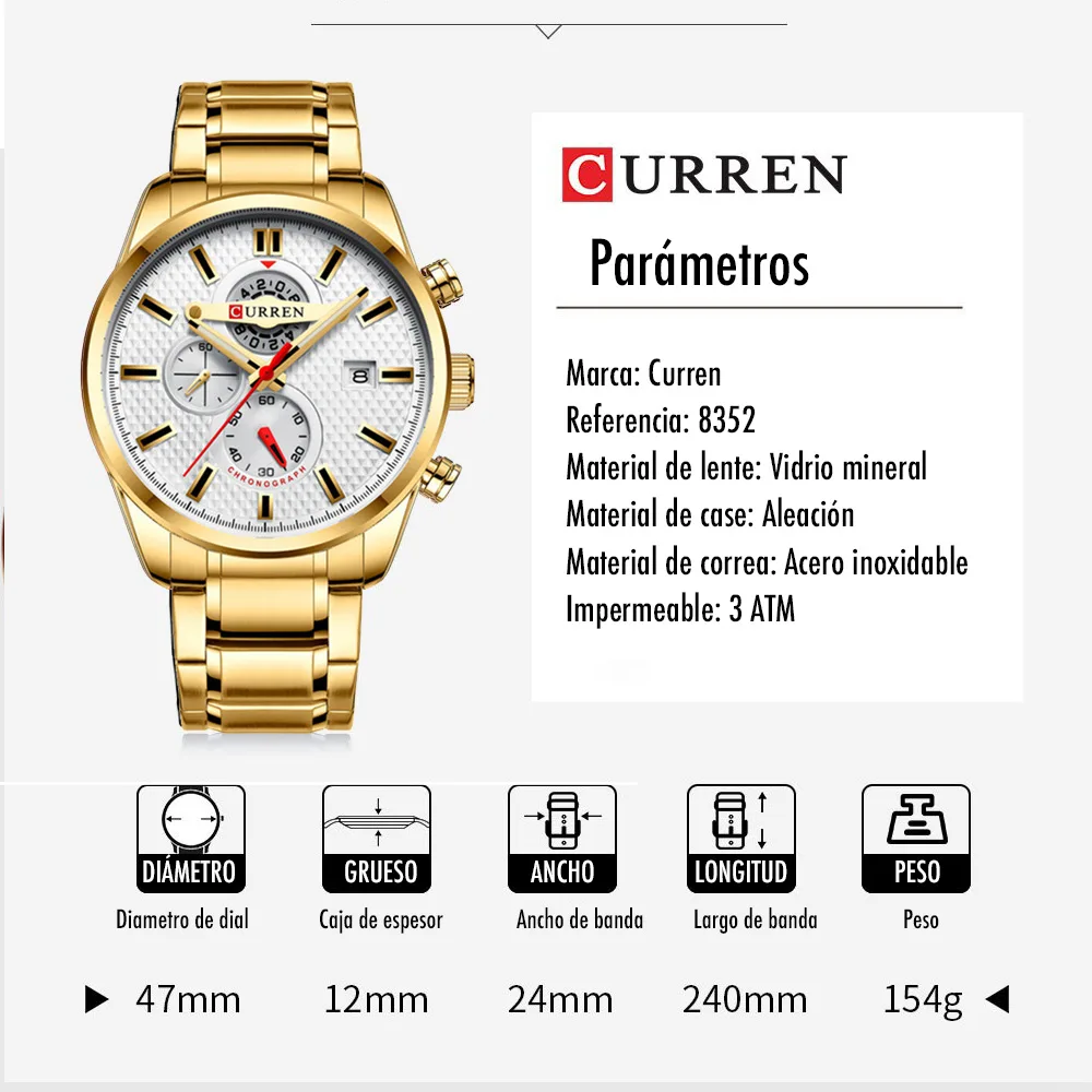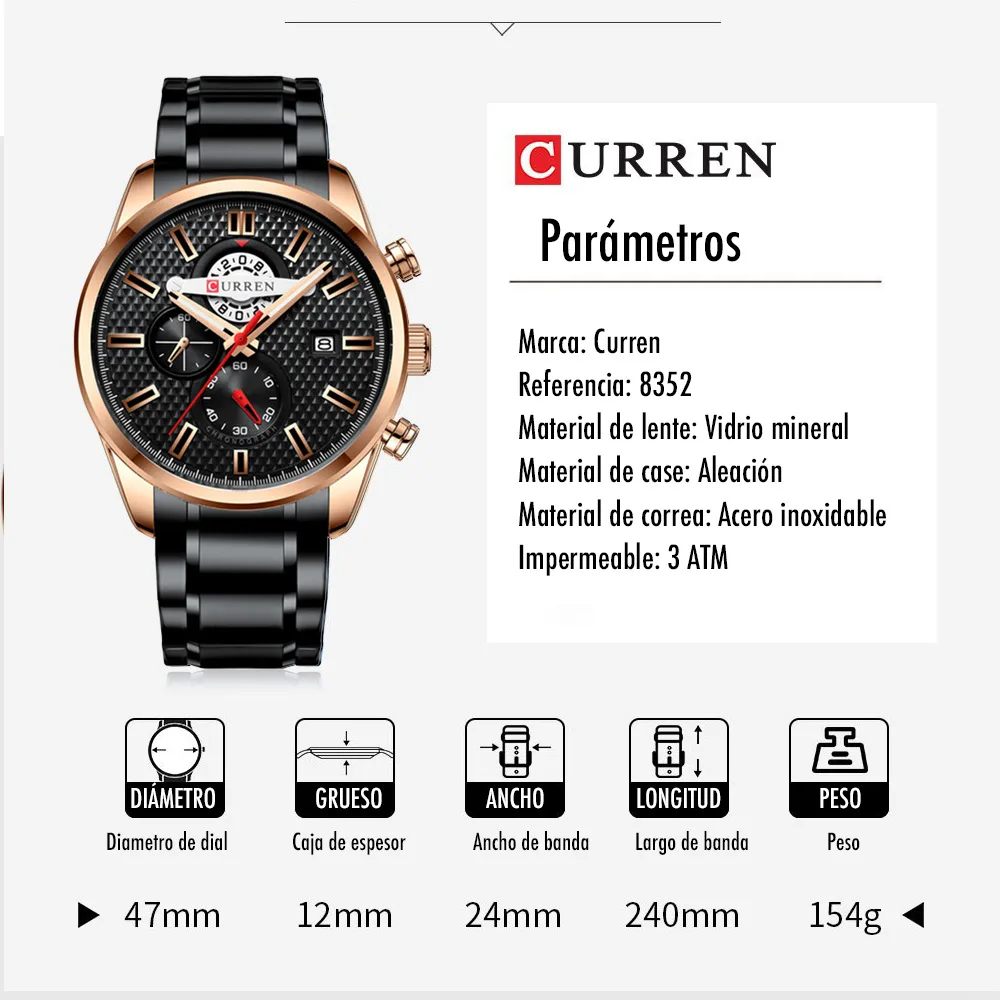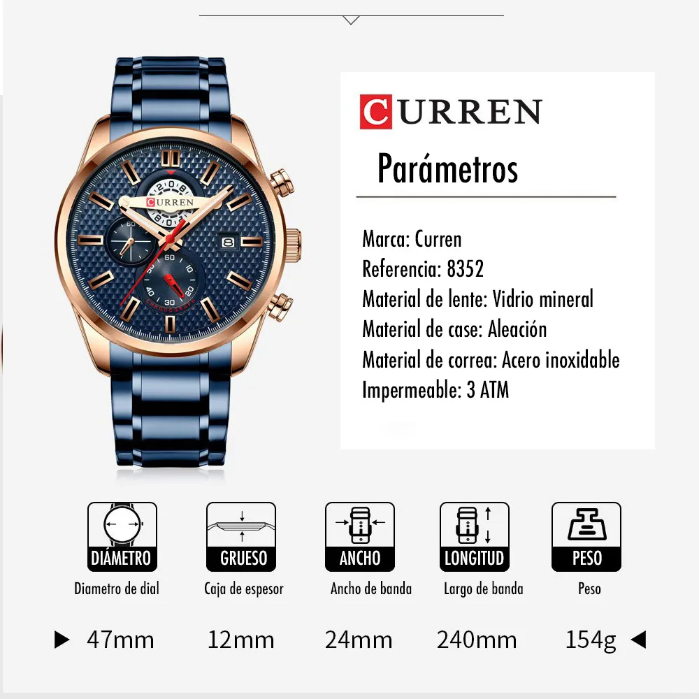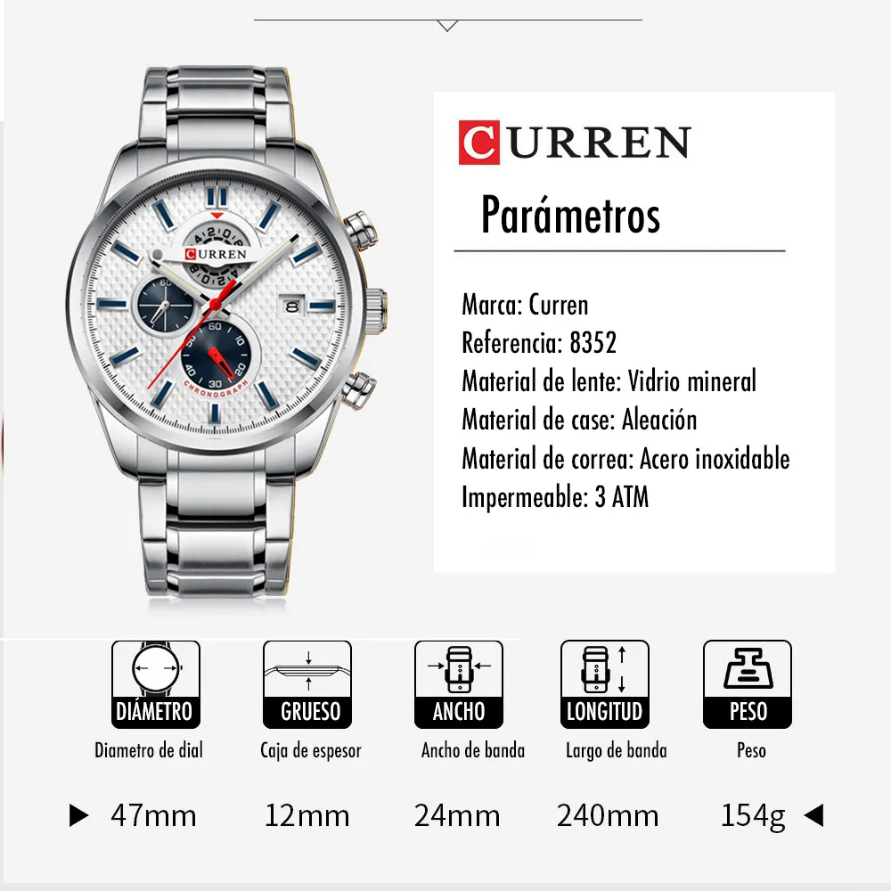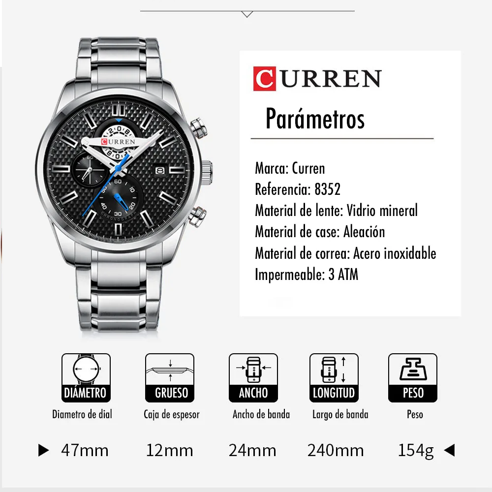 El Reloj Curren 8352 es un cronografo para hombre que combina diseño y funcionalidad. Dispone de cronografos funcionales, calendario. Movimiento de cuarzo de alta precision. Material: Acero inoxidable. Cierre pulsera: Mariposa. Colores disponibles: Plateado-Negro, Azul, Dorado. Precio: $180,000 COP. Envio en 1 dia habil.