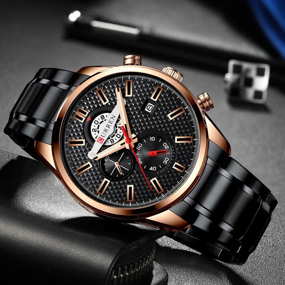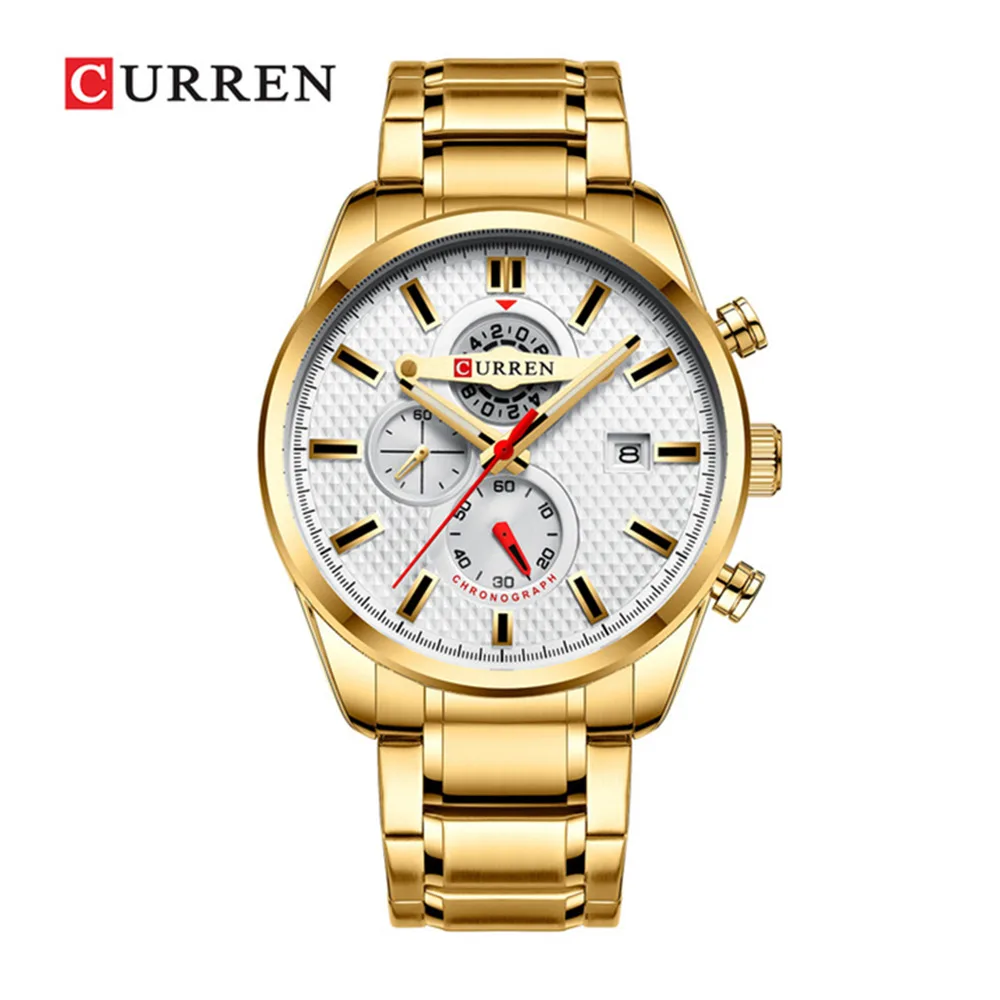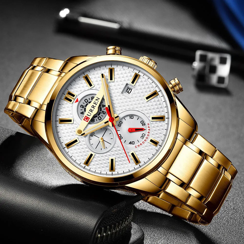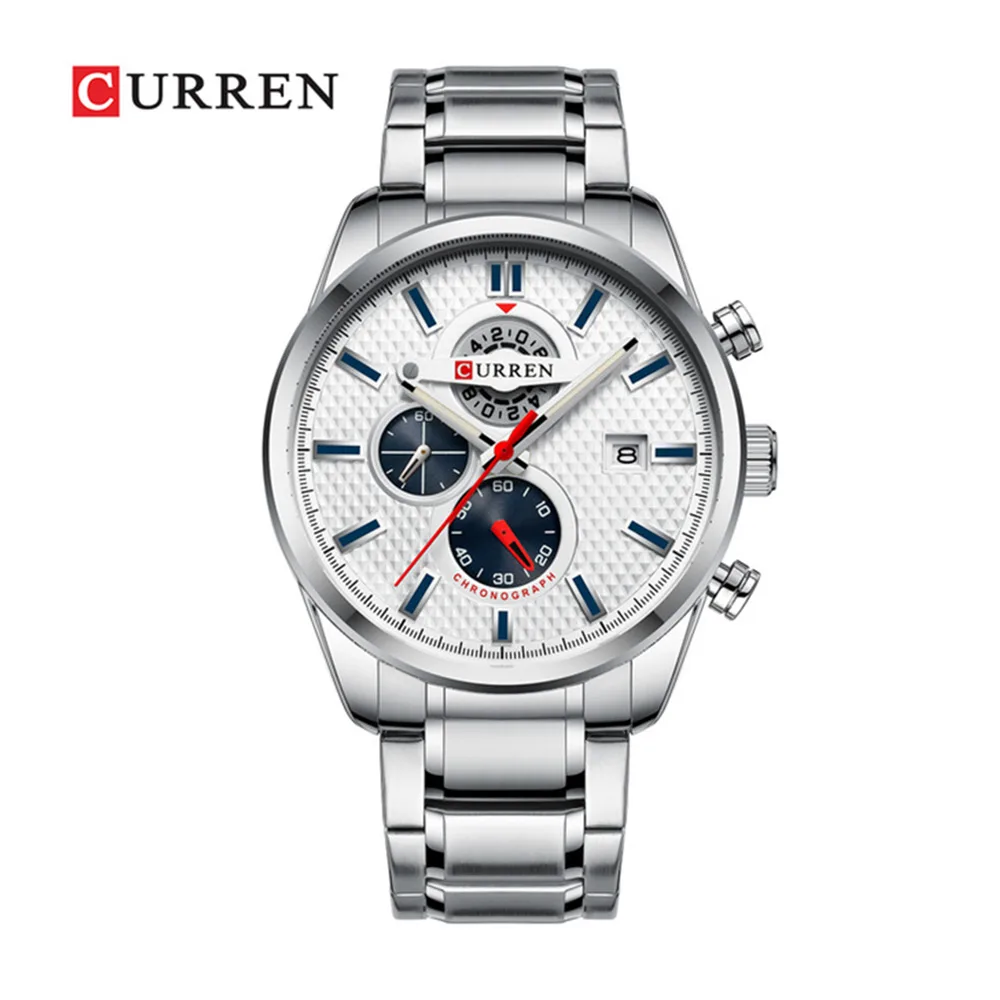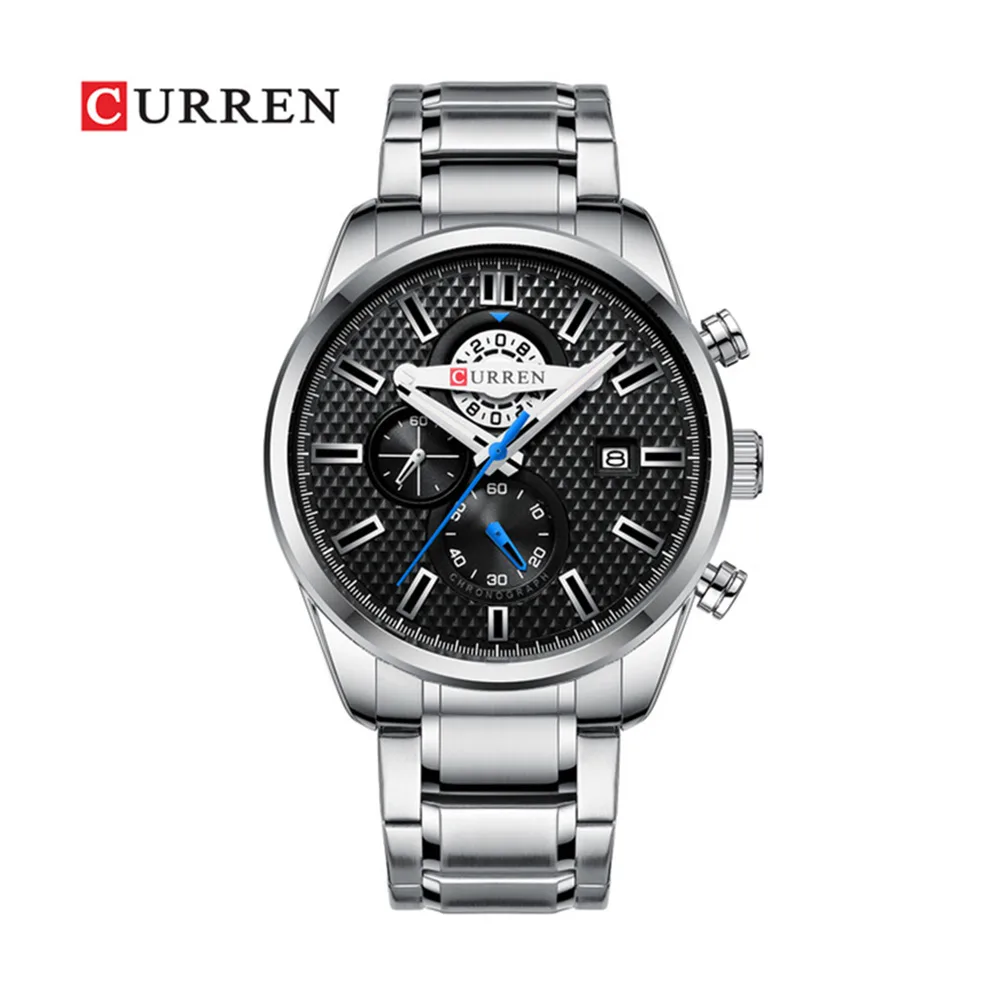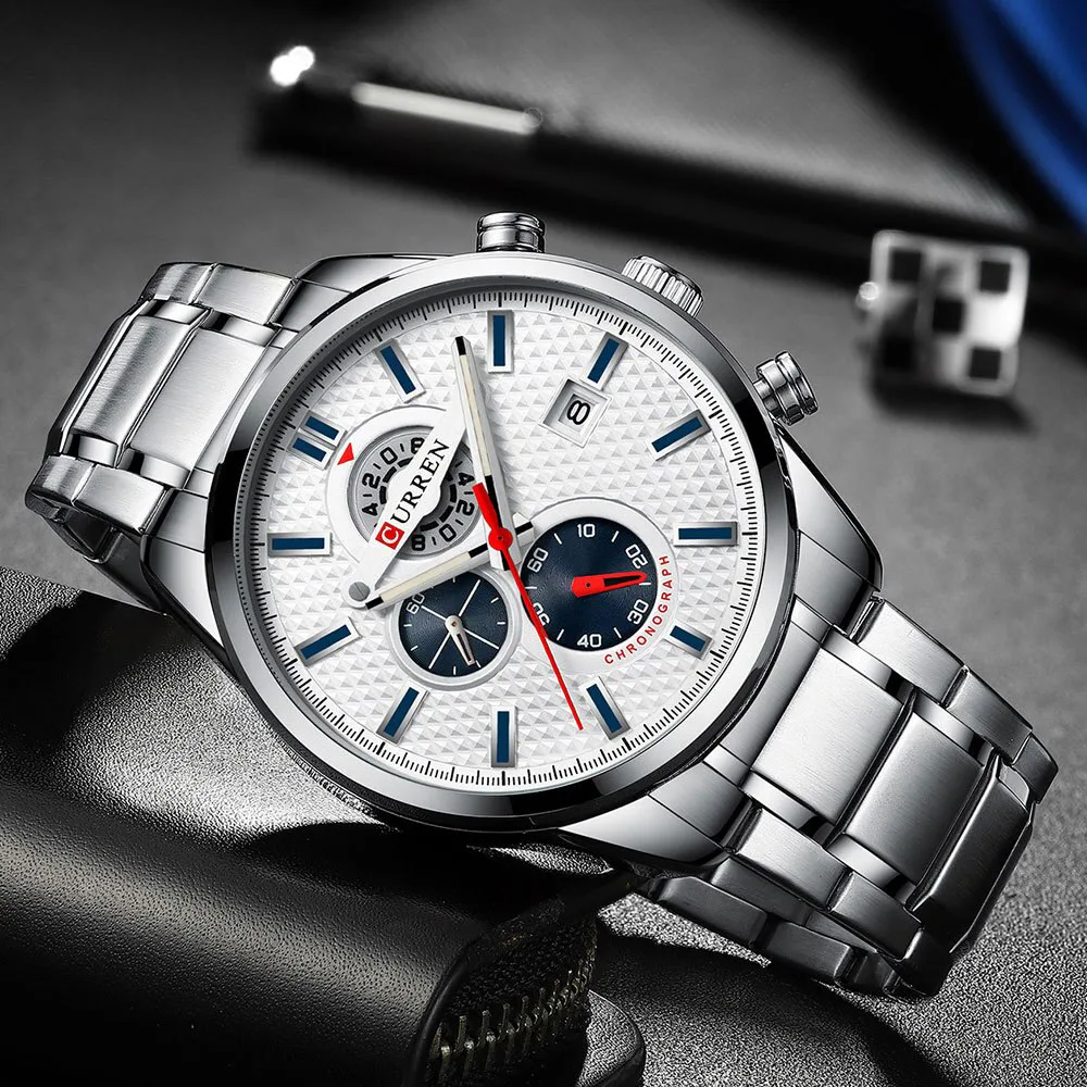 El Reloj Curren 8352 es un cronografo para hombre que combina diseño y funcionalidad. Dispone de cronografos funcionales, calendario. Movimiento de cuarzo de alta precision. Material: Acero inoxidable. Cierre pulsera: Mariposa. Colores disponibles: Plateado-Negro, Azul, Dorado. Precio: $180,000 COP. Envio en 1 dia habil.