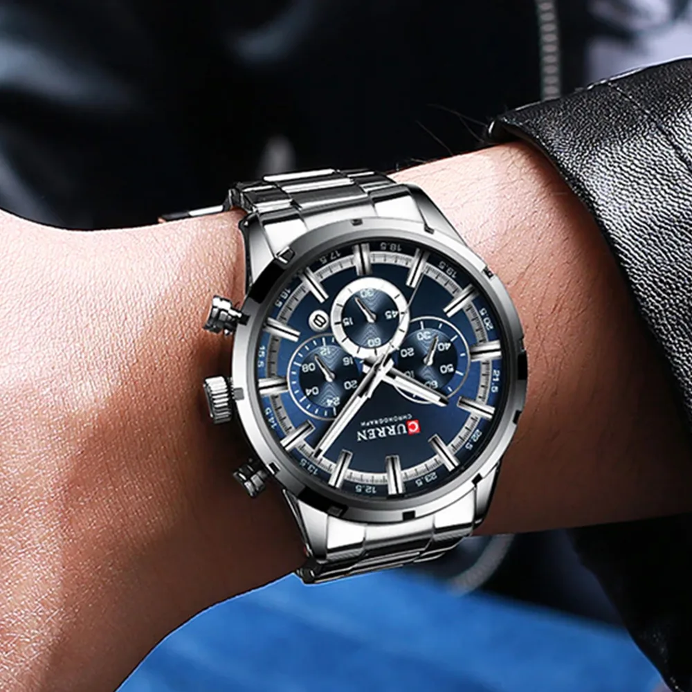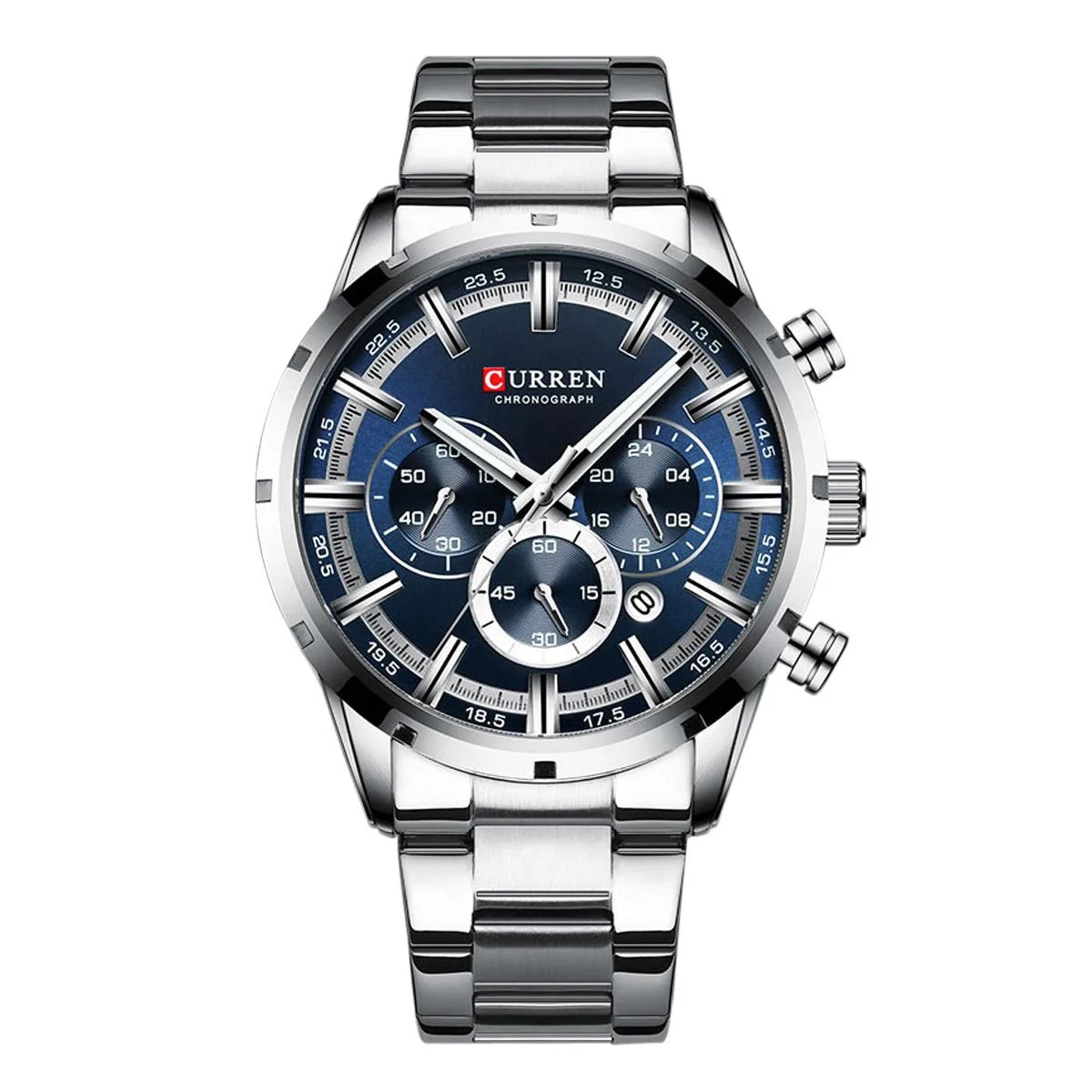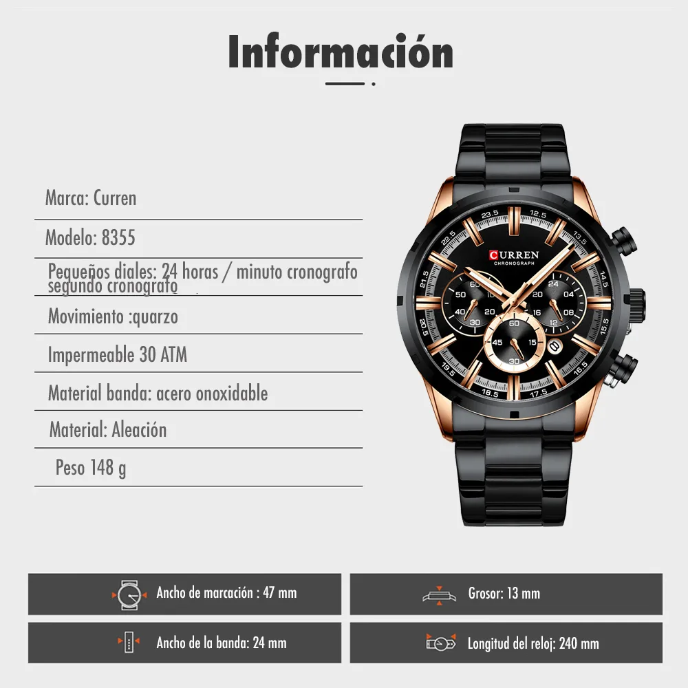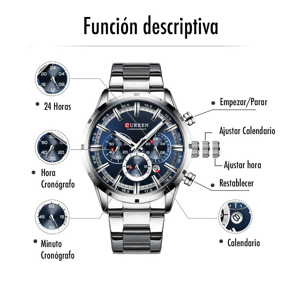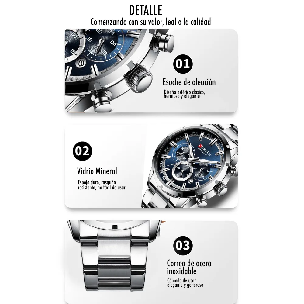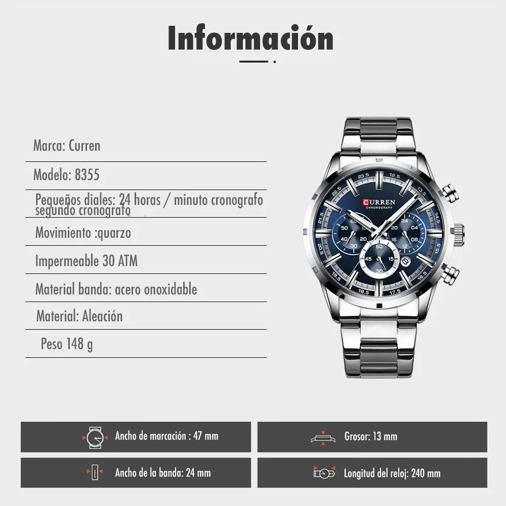 El Reloj Curren 8355 es un cronografo para hombre que combina diseño y funcionalidad. Dispone de cronografos funcionales, calendario, resistente al agua. Movimiento de cuarzo de alta precision. Material: Acero inoxidable. Cierre pulsera: Mariposa. Colores disponibles: Plateado-Negro, Negro, Plateado-Blanco, Plateado-Azul. Precio: $180,000 COP. Envio en 1 dia habil.