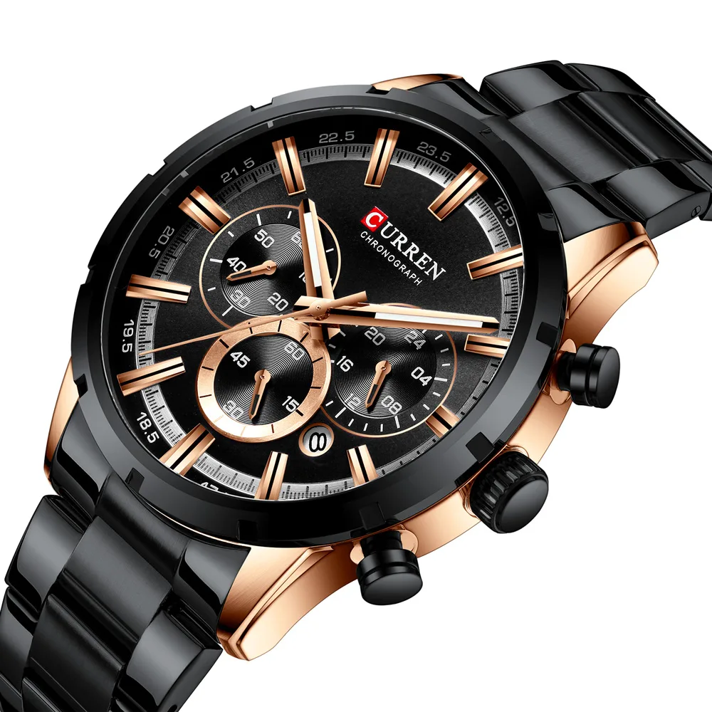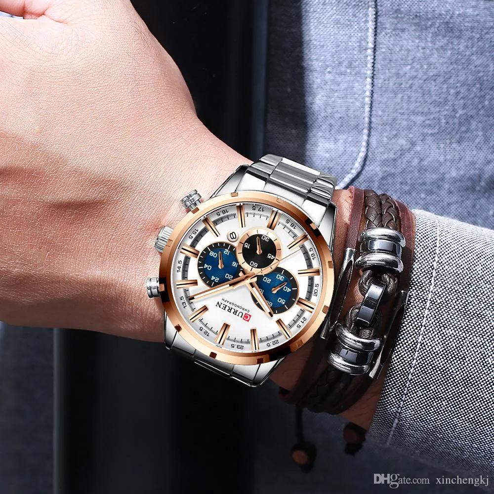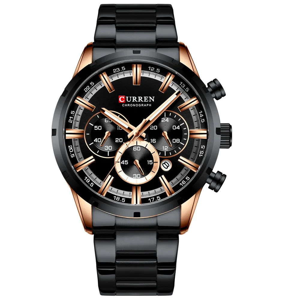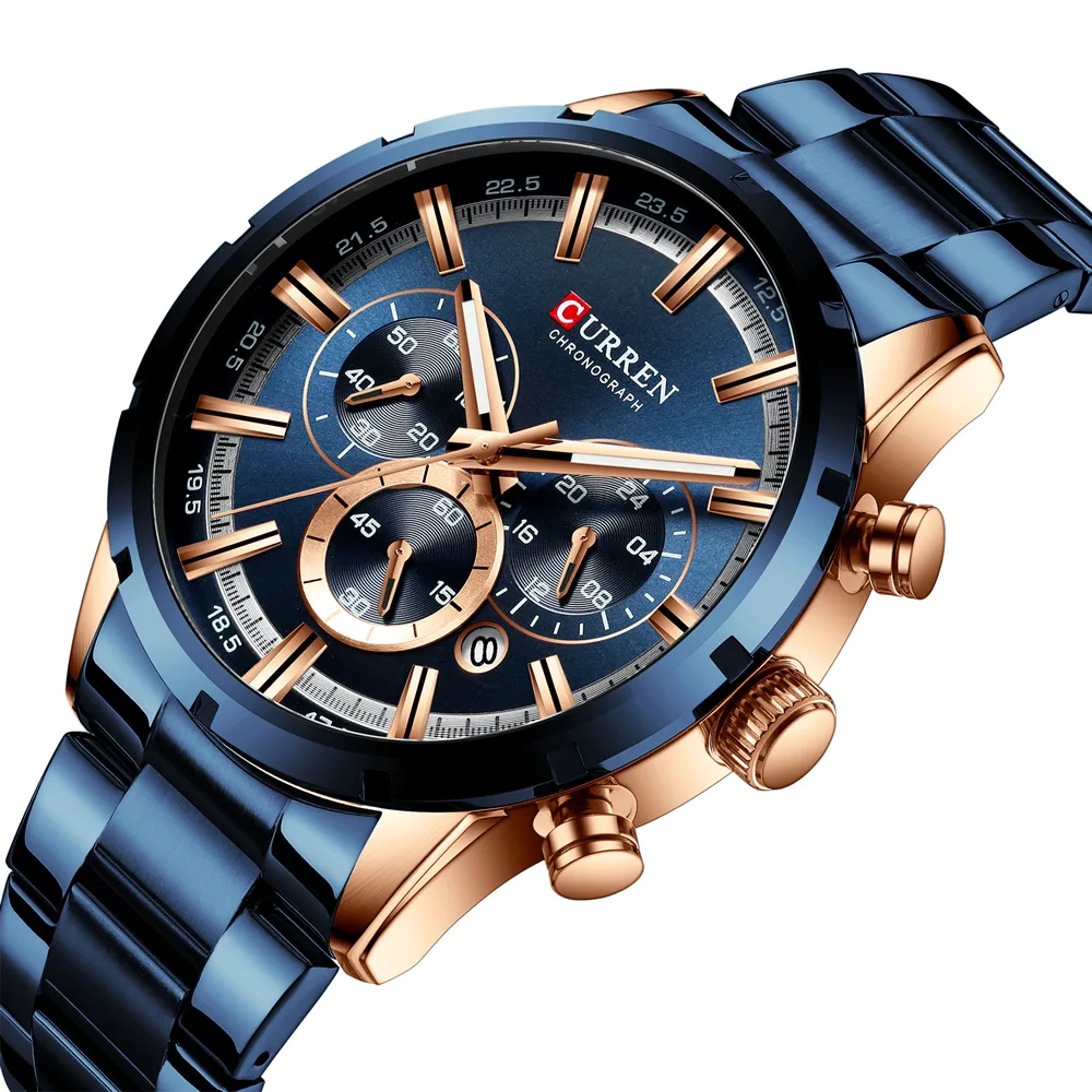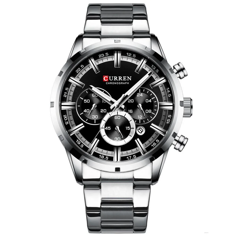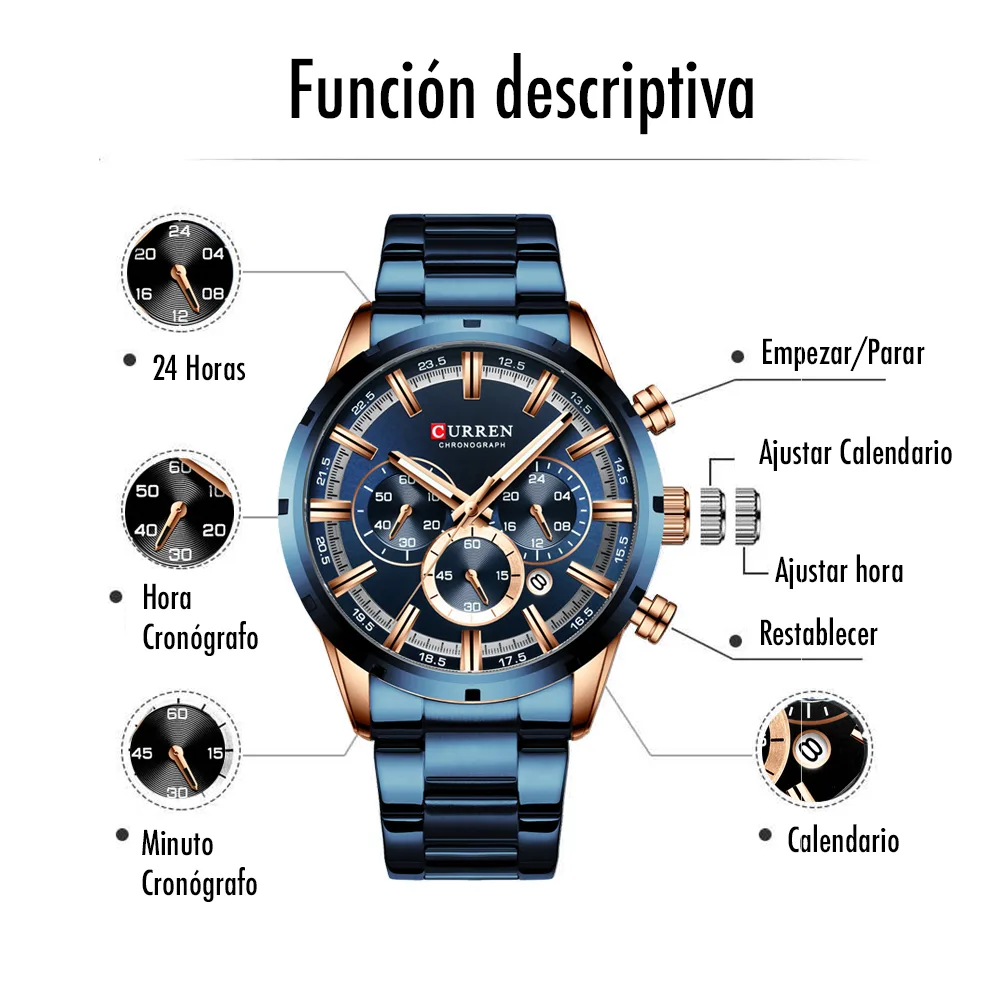 El Reloj Curren 8355 es un cronografo para hombre que combina diseño y funcionalidad. Dispone de cronografos funcionales, calendario, resistente al agua. Movimiento de cuarzo de alta precision. Material: Acero inoxidable. Cierre pulsera: Mariposa. Colores disponibles: Plateado-Negro, Negro, Plateado-Blanco, Plateado-Azul. Precio: $180,000 COP. Envio en 1 dia habil.