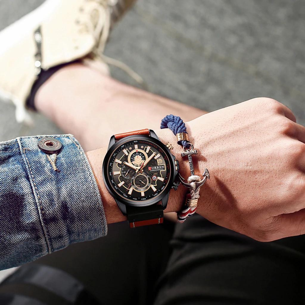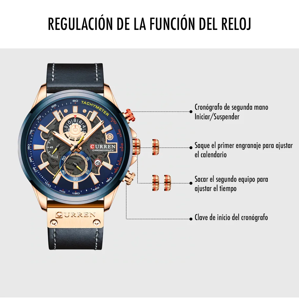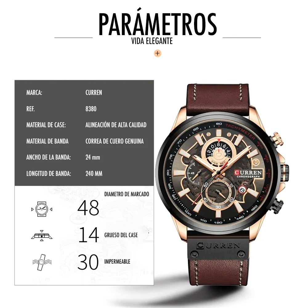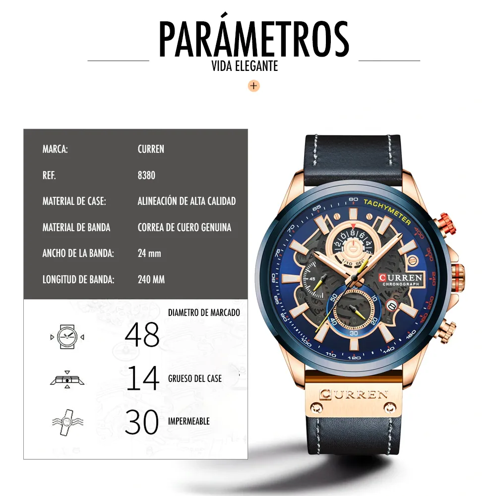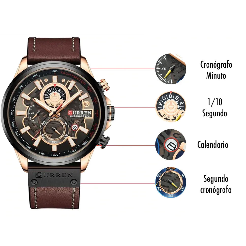 El Reloj Curren 8380 es un cronografo para hombre que combina diseño y funcionalidad. Dispone de cronografos funcionales, calendario. Movimiento de cuarzo de alta precision. Material: Caja en Acero inoxidable y pulso en cuero. Cierre pulsera: Hebilla. Colores disponibles: Azul, Cafe, Cafe-Claro. Precio: $180,000 COP. Envio en 1 dia habil.