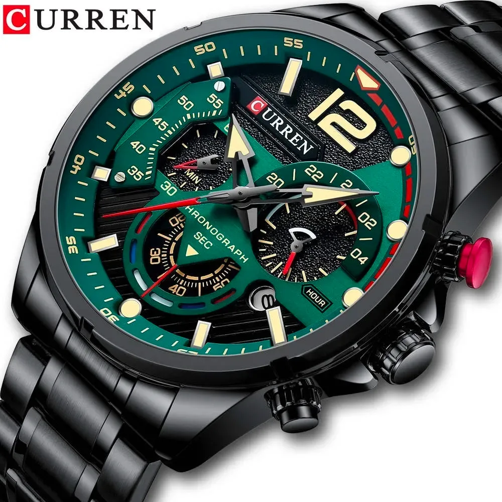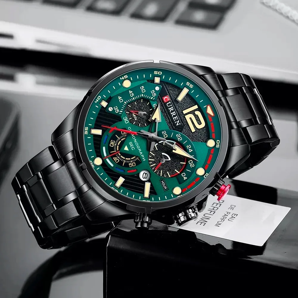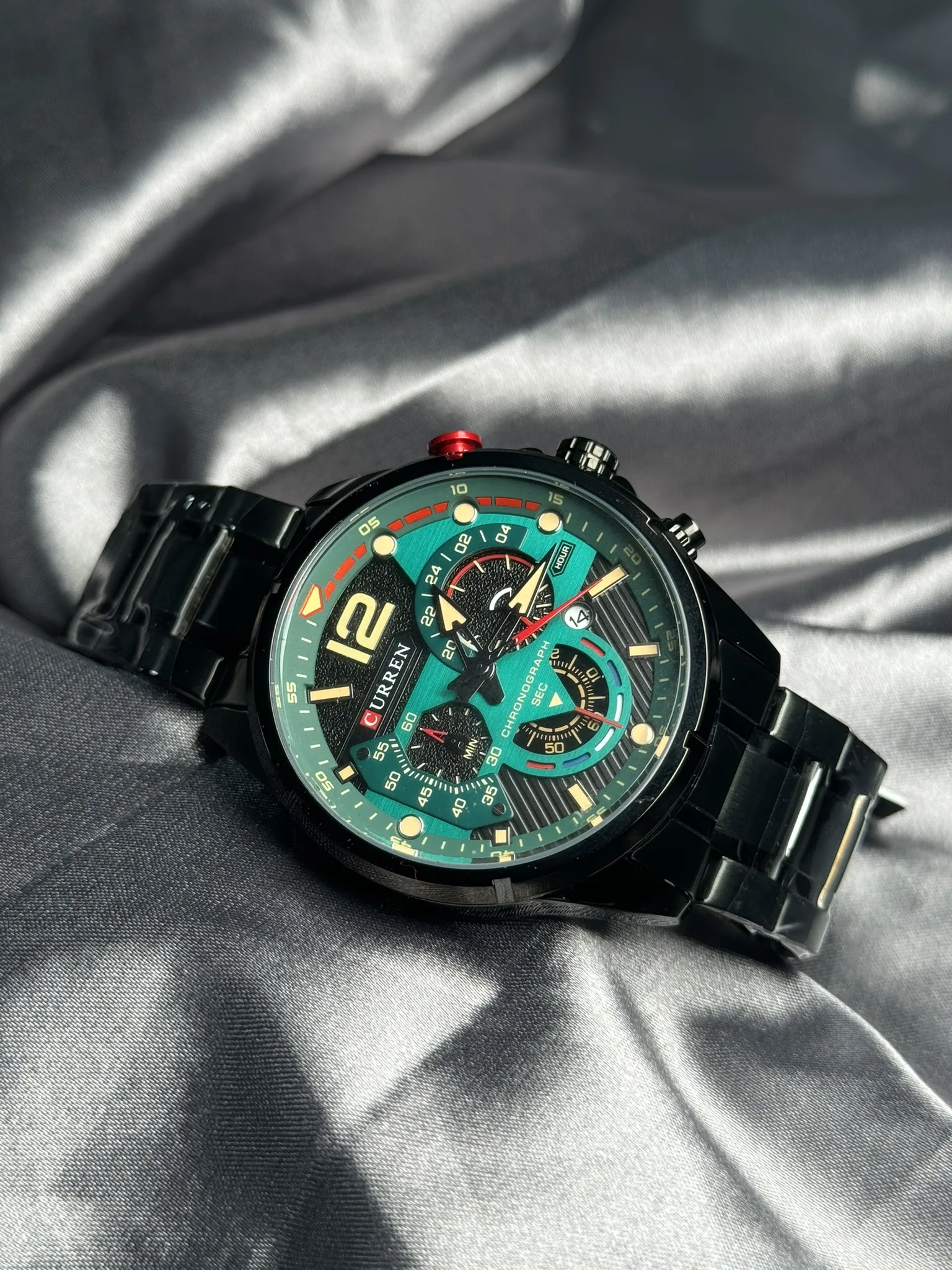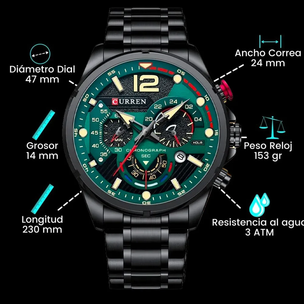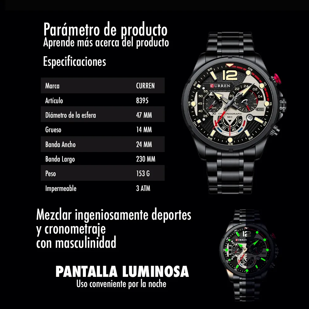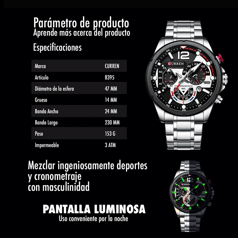 El Reloj Curren 8395 es un cronografo para hombre que combina diseño y funcionalidad. Dispone de cronografos funcionales, calendario, hora militar. Movimiento de cuarzo de alta precision. Material: Acero inoxidable. Cierre pulsera: Mariposa. Colores disponibles: Negro-Dorado, Negro-Verde, Negro-Negro, Azul, Plateado. Precio: $180,000 COP. Envio en 1 dia habil.