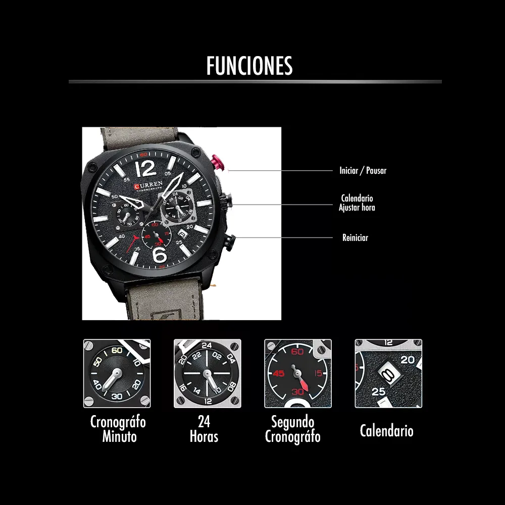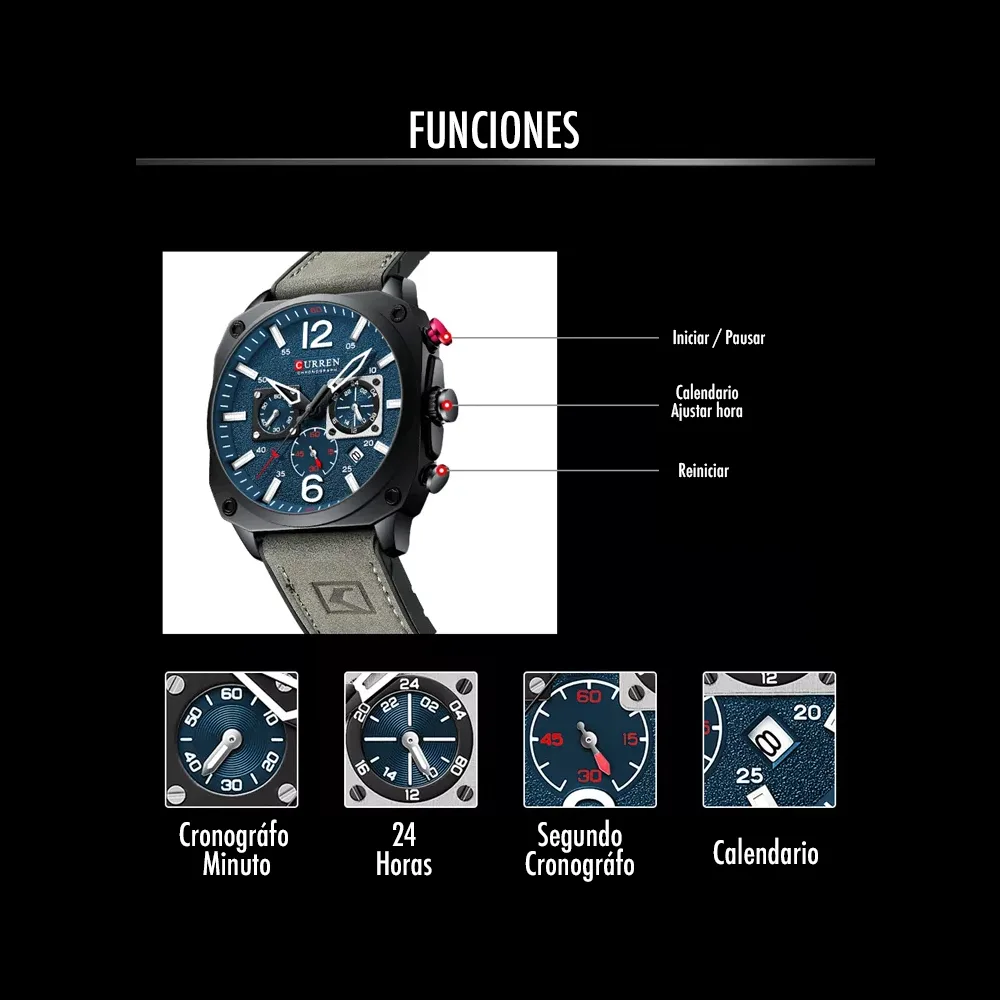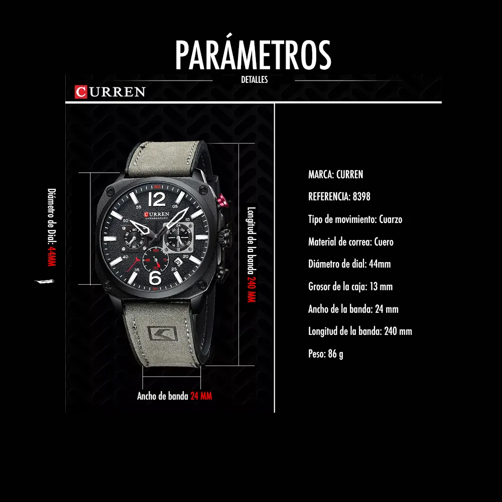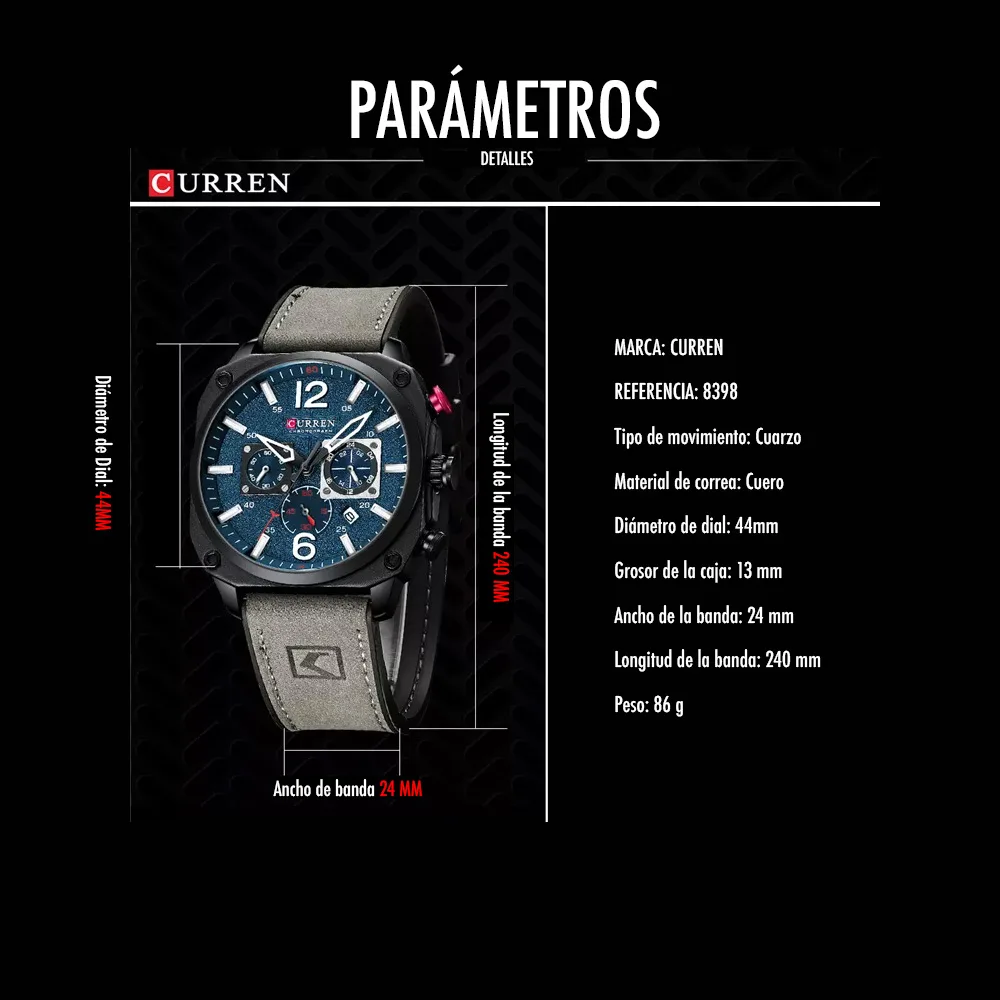 El Reloj Curren 8398 es un cronógrafo para hombre que combina diseño y funcionalidad. Caja en acero inoxidable, correa en cuero con cierre mariposa. Movimiento cuarzo, Cronógrafos funcionales, Calendario. Disponible en 4 colores. Entrega rápida en Neiva y el Huila. Referencia: 8398 | Tipo: Cronógrafo para Hombre | Movimiento: Cuarzo | Caja: Acero inoxidable | Correa: Cuero | Cierre: Mariposa | Colores: Verde, Gris - Negro, Café, Gris - Azul | Precio: $120,000 COP | Marca: Curren