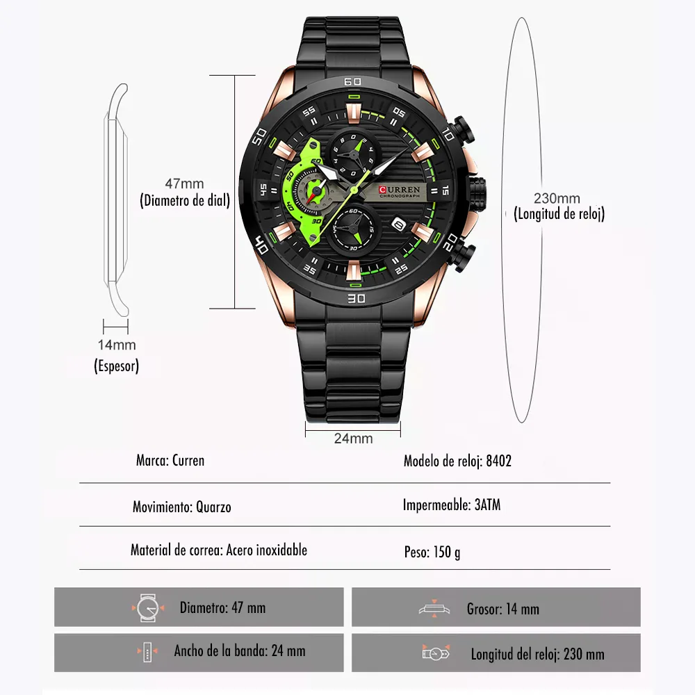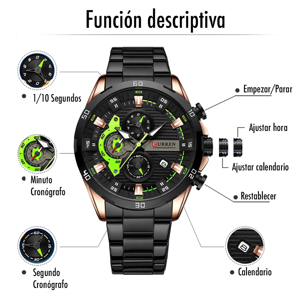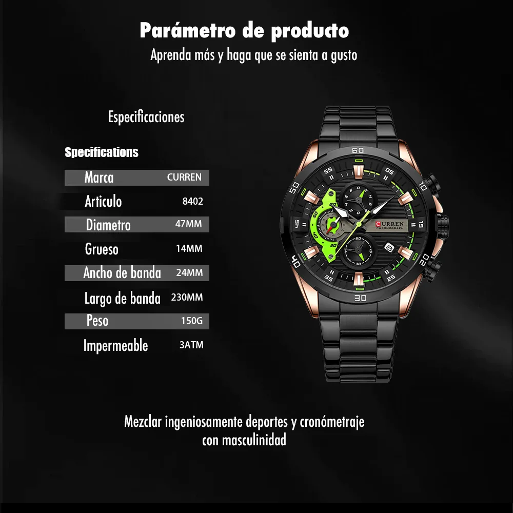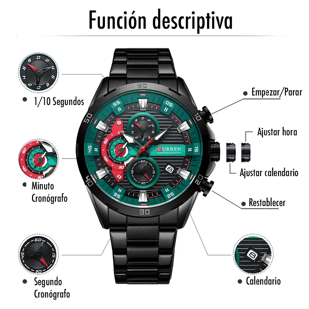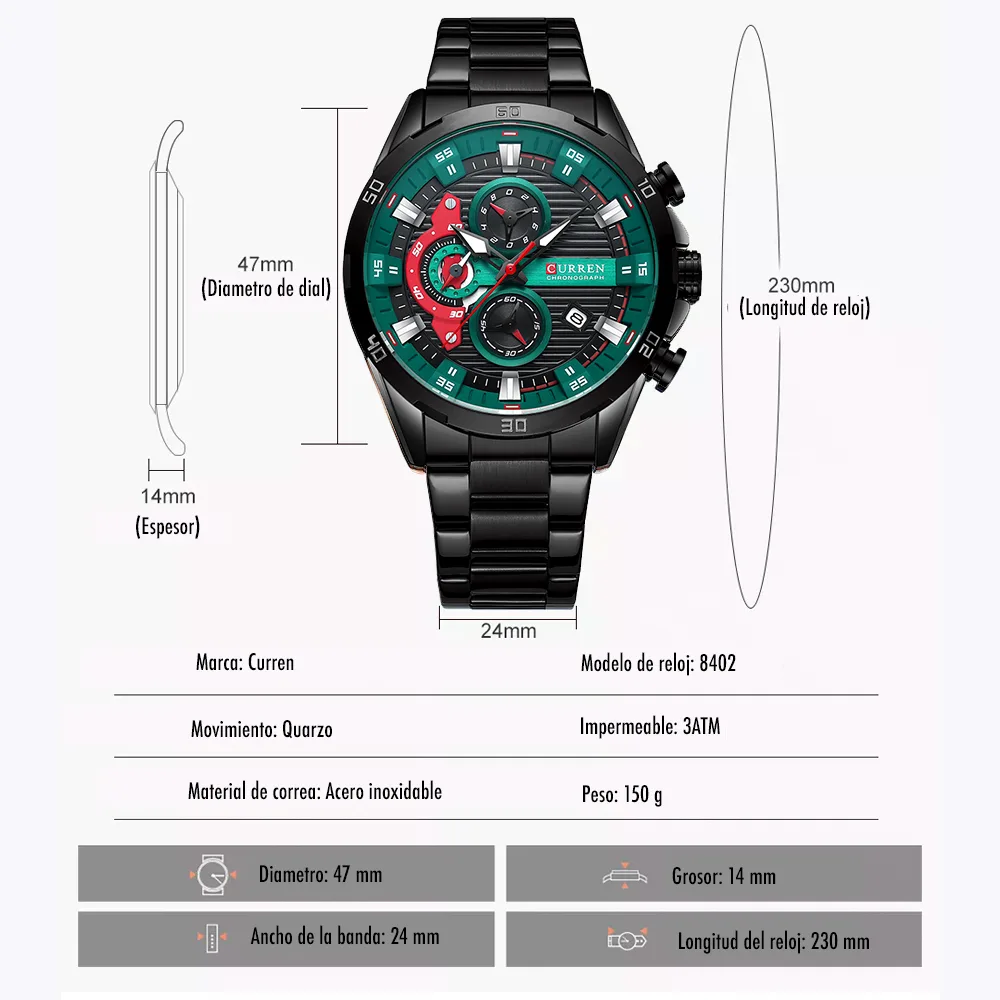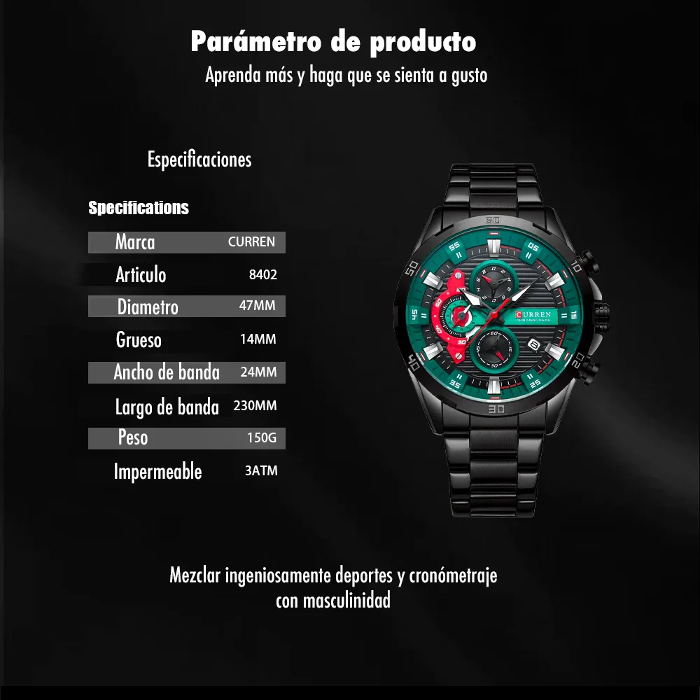 El Reloj Curren 8402 es un cronografo para hombre que combina diseño y funcionalidad. Dispone de cronografos funcionales, calendario. Movimiento de cuarzo de alta precision. Material: Acero inoxidable. Cierre pulsera: Mariposa. Colores disponibles: Negro-Verde, Negro, Plateado, Azul. Precio: $180,000 COP. Envio en 1 dia habil.