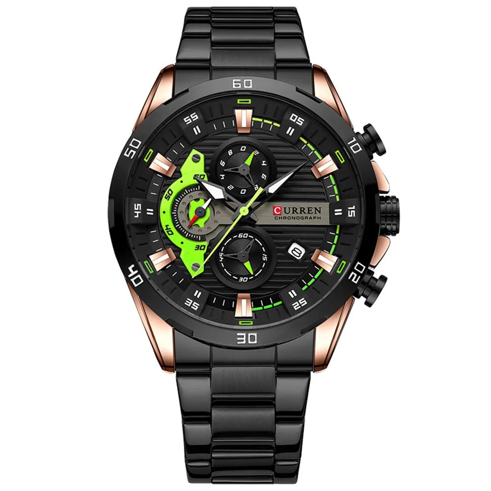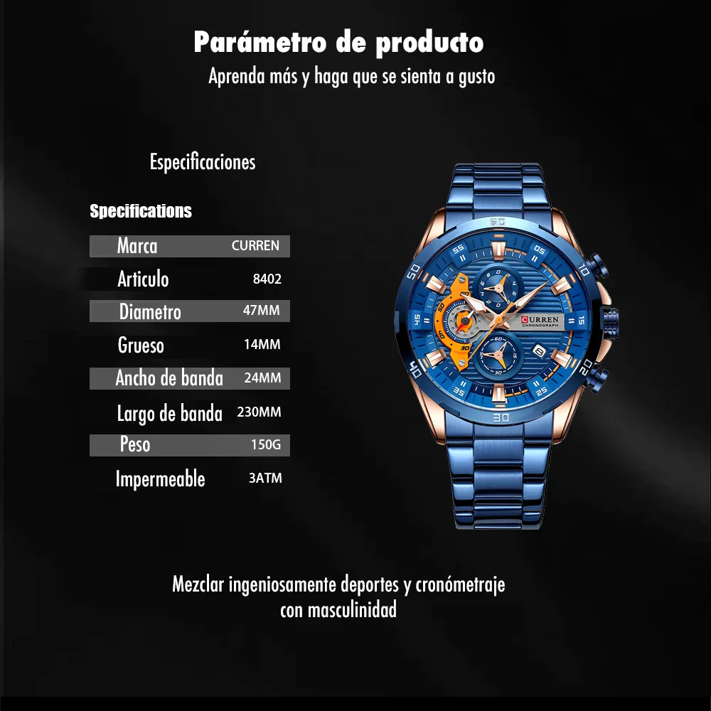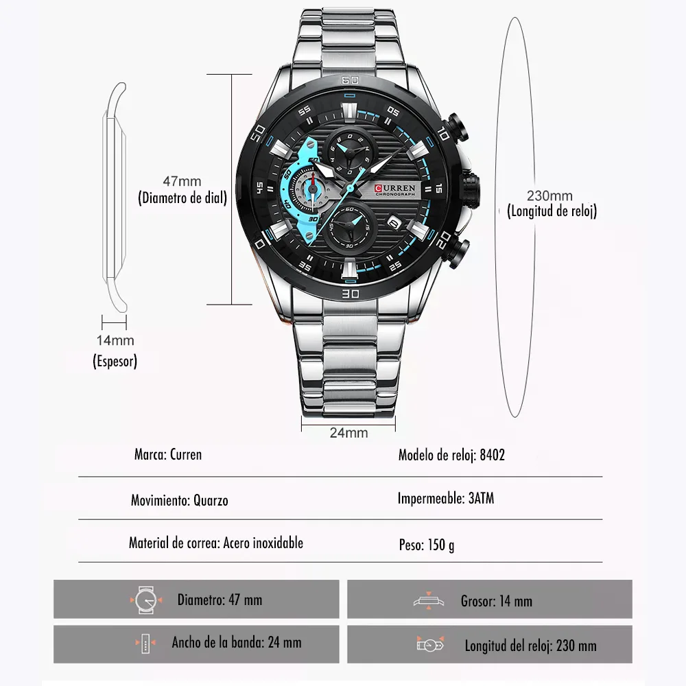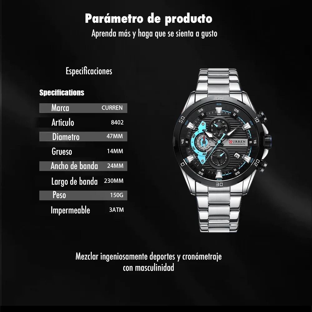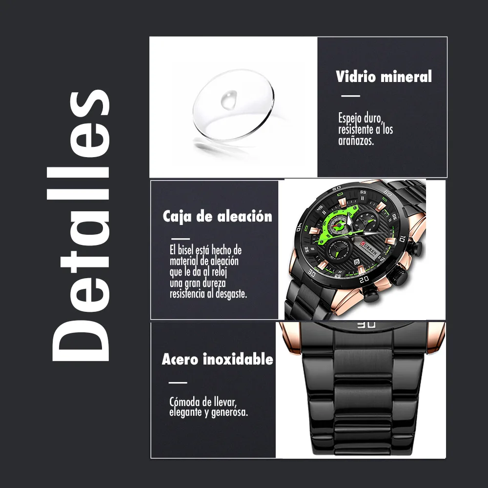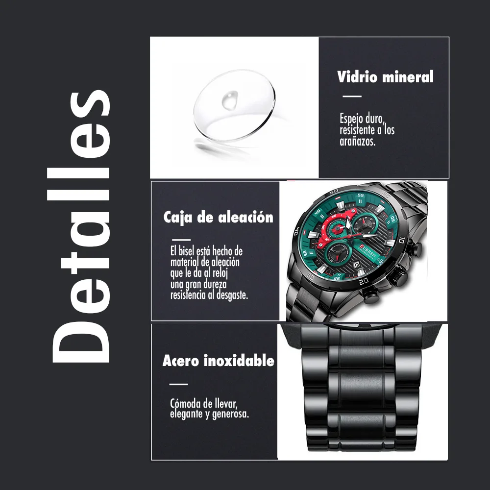 El Reloj Curren 8402 es un cronografo para hombre que combina diseño y funcionalidad. Dispone de cronografos funcionales, calendario. Movimiento de cuarzo de alta precision. Material: Acero inoxidable. Cierre pulsera: Mariposa. Colores disponibles: Negro-Verde, Negro, Plateado, Azul. Precio: $180,000 COP. Envio en 1 dia habil.